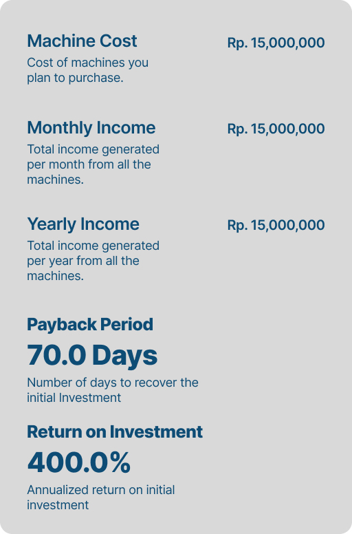 The machine can run 24/7, providing stable income. Operational costs, including staffing, are minimal. So every rupiah you invest will work hard to give you a quick return on your investment.